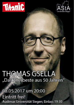 Der AStA lädt ein zu einer Lesung von und mit dem ehemaligen Titanic-Chefredakteur Thomas Gsella. Bereits 2013 besuchte uns Gsella in Siegen und begeisterte die Zuschauer*innen. Nun kommt er am 8. Mai 2017 zu uns ins Audimax. In seinem neuen Bühnenprogramm präsentiert der Ringelnatz- und Gernhardt-Preisträger und ehemalige “Titanic”-Chefredakteur die schönste komische Prosa und Lyrik, die er jemals geschrieben hat: erste, noch tastende Reime seiner Jugendzeit, die schon selbstbewußteren und praktisch fehlerfreien Schmäh- und Wutwerke seiner mittleren Phase und natürlich die lebensklugen, wo nicht bereits stark altersweisen Lyrikhämmer und Kracher der letzten Jahre.